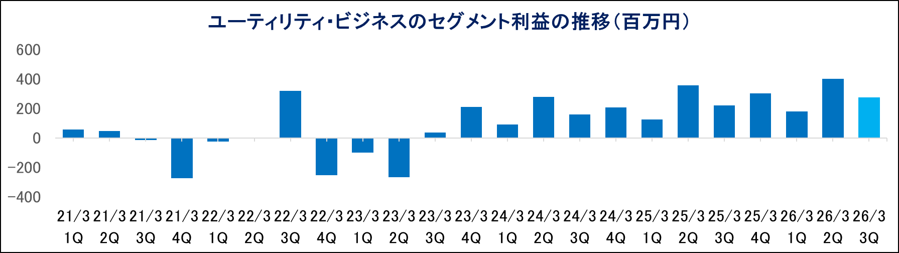 - 26/3期第3四半期累計の決算は前年同期比6.8%の減収、同13.8%の経常増益。売上面は、連結範囲から2社が除外となったことが影響した。利益面では、主にユーティリティ・ビジネスにおいて、契約件数が堅調に伸びたことが寄与した。ユーティリティ・ビジネスは前年同期比0.7%の減収ながら、同21.3%のセグメント増益の好決算となった。また、コンサルティング・ビジネスでも、保険サービスとクラウドサービスの伸長により、前年同期比1.5%の増収ながら、同184.5%のセグメント増益となった。