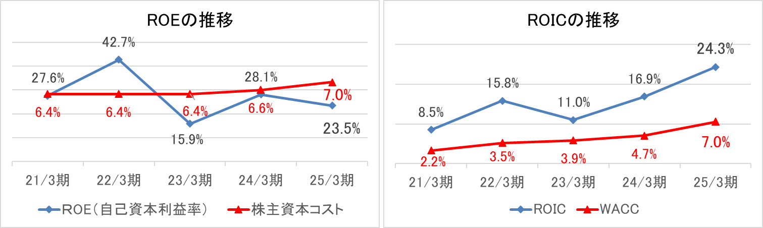 25/3期のROEは23.5%となった。ROEは前期に引き続き増益となったものの純資産の増加が上回り、前期比4.6ポイント低下した。エクイティスプレッドも前期比4.9ポイントの低下となった。一方、ROICは、前年比7.4ポイント上昇し、ROICスプレッドも前期比上昇した。引き続き成長目標としてROE(自己資本利益率)の向上とWACCを超えるROIC(投下資本利益)の創出を推進する。