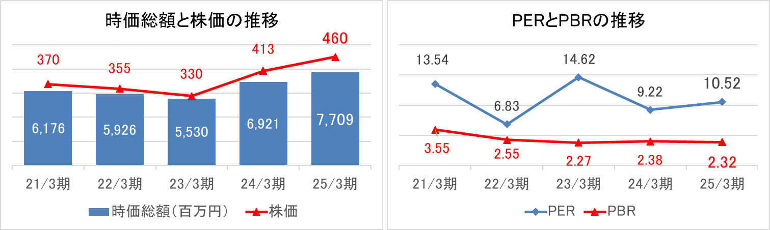 株価は直近5年の期末平均株価が385円に対し、直近は560~570円台で推移。PBRは継続的に2倍台を推移しているものの、PERは約10倍とスタンダード市場の平均よりも低位となっており、持続的な成長シナリオの明確化が課題となっている。