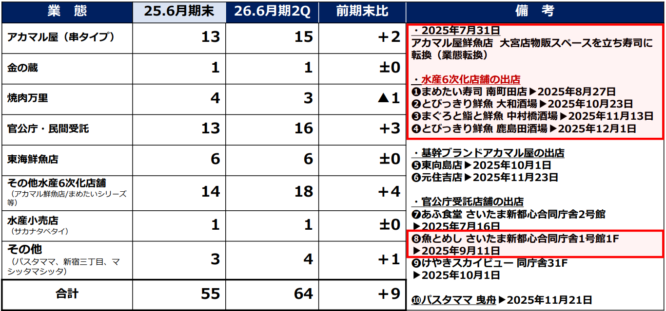 期初に中間期の予想は発表しておりませんでした。既存店の売上が前年比4%増と堅調に推移しており、売上高については概ね計画通りとなっております。一方、営業利益については想定を若干下回っている状況です。要因としては出店が通期計画で9店舗だったものが上期で10店舗出店したことにより、出店費用が計画を上回ったこと、および食材、人件費、エネルギーの高騰によるものです。グループ企業に視野を広げると、綜合食品がかなり好調でした。一方で、子会社SANKO海商(4月1日より綜合食品東海)は従来の仲卸から水産加工に特化することにより業務が縮小しております。