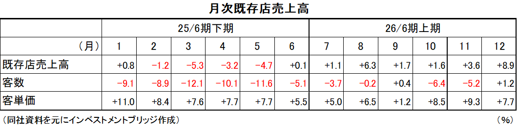- 26/6期中間期の売上高は前年同期比7.6%増の49億85百万円。SANKO店舗数の増加により1億60百万円、豊洲市場の大卸である綜合食品が1億75百万円の増収となった。飲食事業においては、「アカマル屋」がコロナ禍で変化した顧客ニーズにマッチするブランドとして成長している。水産6次化の強みを活かした新たな業態として、「まめたい商店」「まめたい寿司」に続き「とびっきり鮮魚」「まぐろと鮨と鮮魚」を開発した。営業損失は3億33百万円(前年同期は3億45百万円の損失)。利益面では、売上総利益率が「水産6次化」の進捗に伴う粗利改善やSANKO海商の粗利改善により前年同期34.6%から35.1%へ改善した。販管費率は人件費増とコスト増はあったが、前年同期42.1%から41.8%へ低下した。経常損失は3億7百万円(前年同期は3億14百万円の損失)、中間純損失は3億15百万円(同3億34百万円の損失)。既存店売上は、引き続き物価高騰による消費者の買い控えが続く中、水産6次化の付加価値商品の導入により客数が回復した。