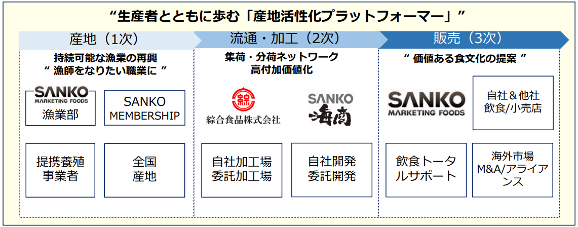 23/3期にグループ入りしたのですが、それまでの荷受け・大卸という立場にSANKOを活用したシナジーが発揮されています。受託を含めて、産地側との接点が増えていくことにより流通量が増加します。加えて、出口としてSANKOの店舗を活用して加工も行っています。それとともに、他社にも提案することも出来ています。さらにはグループ会社のジーエスサンヘイがリゾートホテルなどの客室清掃を行っており、ホテルへの水産物販売の営業も担っております。