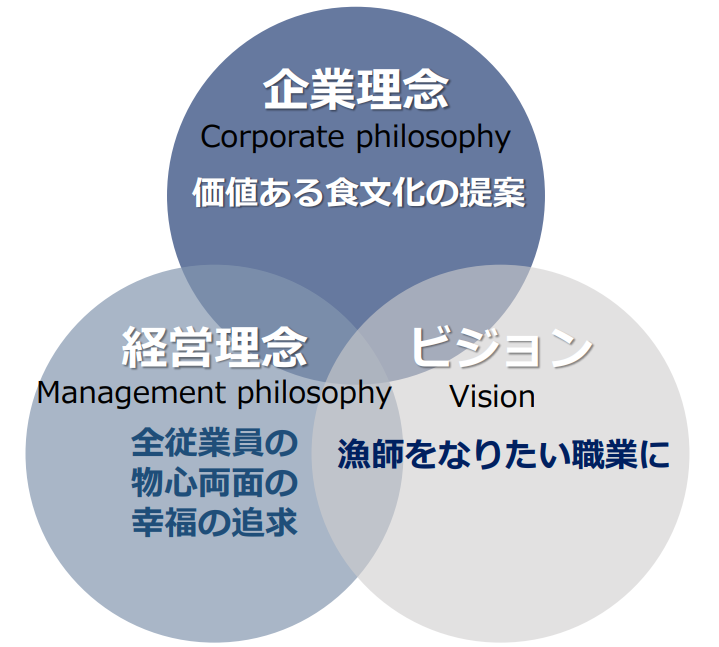 ①価値ある食文化の提案②産地及び生産者への貢献③全従業員の物心両面の幸福の追求