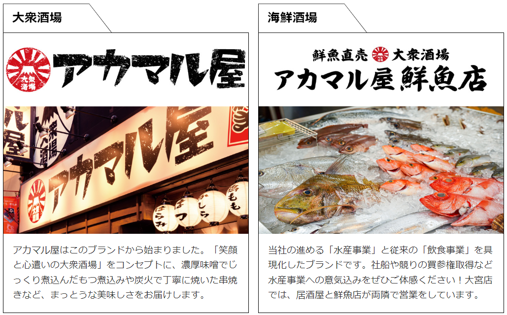 居酒屋店舗の運営を創業来行ってきた。03年にジャスダックへ新規上場。上場時は個室居酒屋「東方見聞録」を主軸に展開してきたが、09年から低価格・全品均一の居酒屋業態「金の蔵jr.」の展開が始まる。11年からは日常食業態「東京チカラめし」の拡大もあわせて行ってきた。14年には現在の主軸ブランドである「アカマル屋」を開発した。20年台に入り、沼津漁協の組合員になったことを皮切りに、水産6次化事業を推進している。