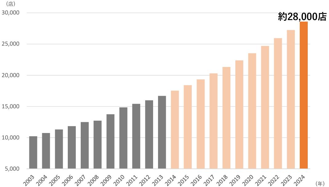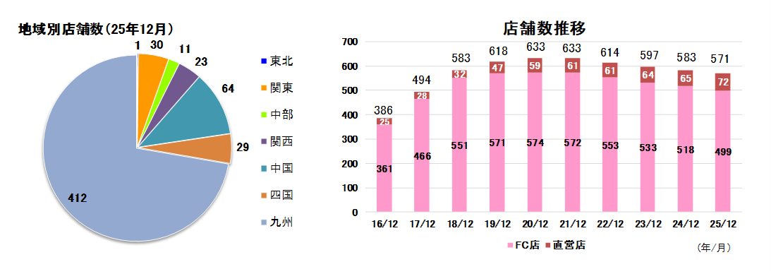 2025年12月現在、1都1府25県に571店舗(FC499店舗、直営72店舗)を出店。