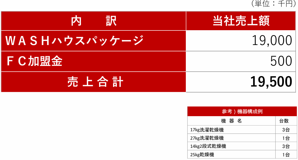 店舗出店を企画し、セルフランドリー機器や店舗装飾など、開店するために必要な全ての内容をセットにした「WASHハウスパッケージ」一式を販売する。このほか、オープン時の広告等開業準備費用、FC加盟金を受領している。