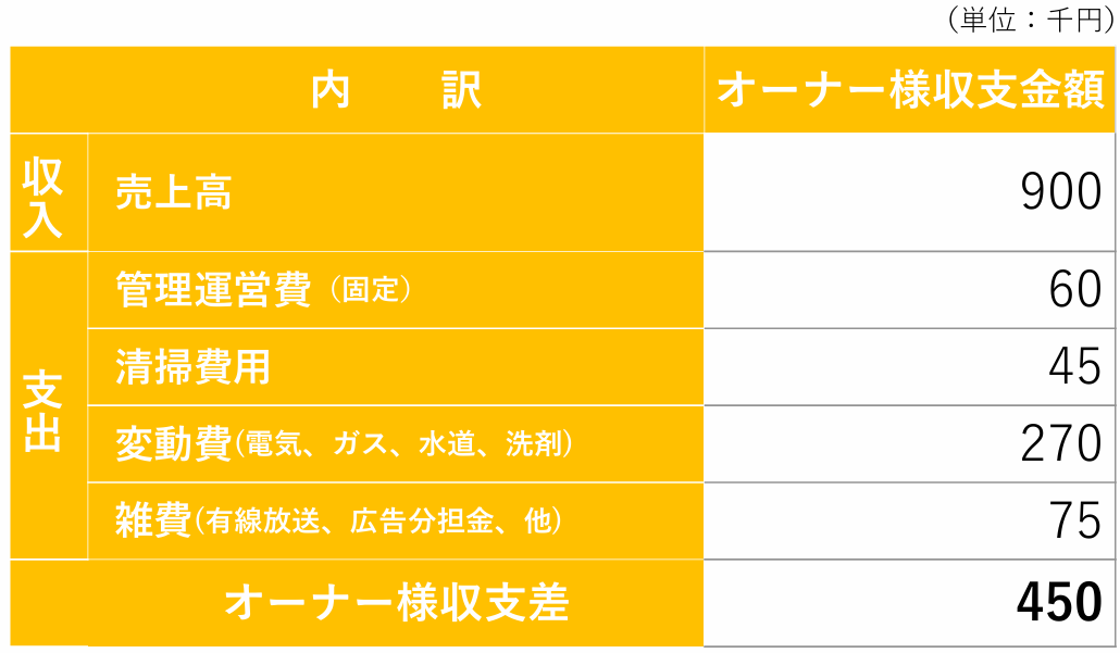 ![]() ※1ヶ月あたりの収益構造モデル。 | オーナーの月間収支モデル