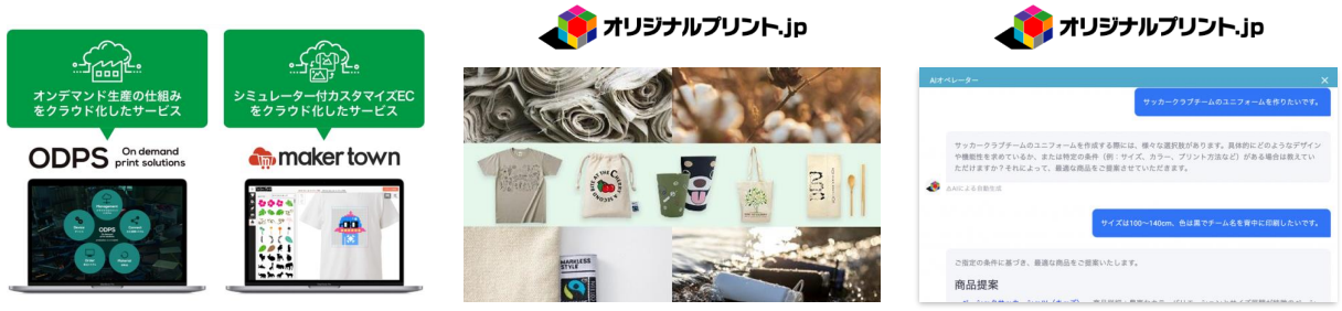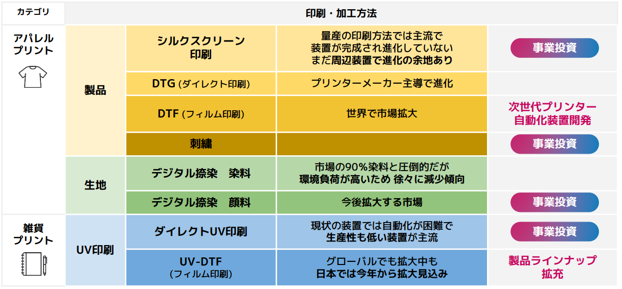 インターネットを利用して行うアパレルや雑貨を主とした商品へのオンデマンドプリントサービス、及びオンデマンドプリントの仕組み(ソフトウエアやハードウエア)をアパレルメーカー、印刷会社などの事業者へ提供するソリューション(オンデマンドプリントソリューションズ)サービスを行っている。これらの実現のために、小ロット受注に対応したソフトウエアと、システムで制御できるハードウエアの開発を進め、ワークフローのDX化を推進している。