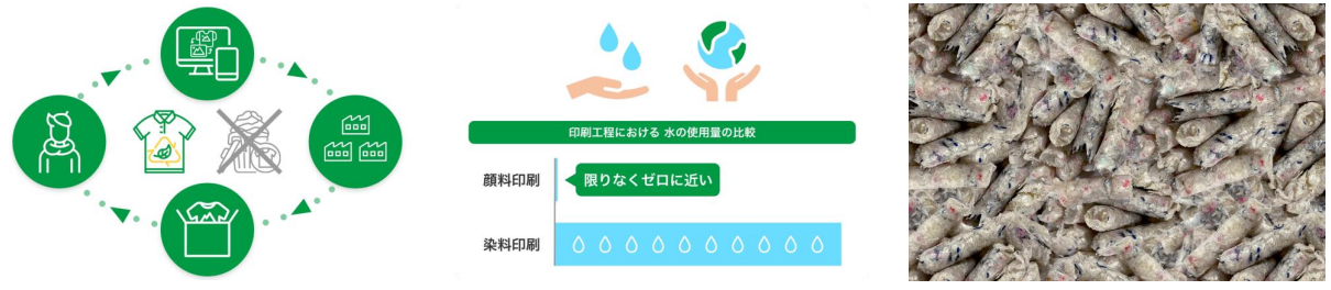 「オンデマンドアパレル」で 持続可能なモノづくりを推進 | 環境負荷の低減に貢献する 顔料インクと昇華染色の採用 | 工場から出る廃棄物の 再資源化(固形燃料化) |