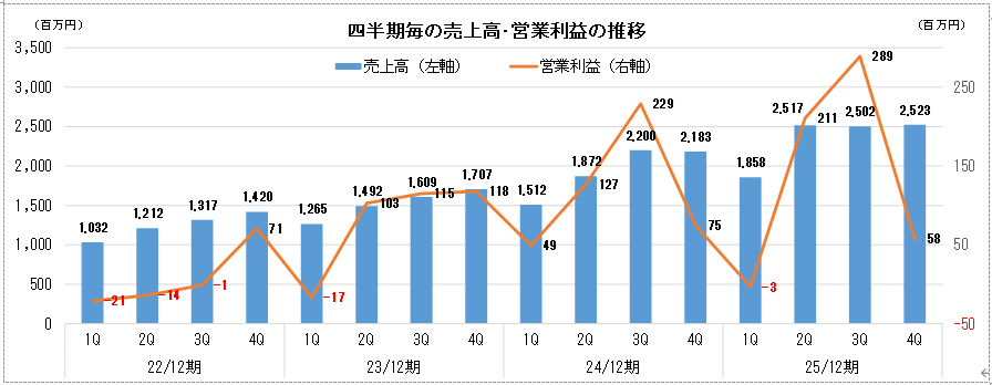 これまでの同社のレポートで、「オンデマンドプリント市場は高い成長性があり、中でもDTF市場が有望である」と伝えてきた。25/12期は、これをしっかりと数字で示すことが出来たといえよう。利益率も向上させている。四半期毎の推移を見ても3Qに営業利益を躍進させている。4Qは先行投資などにより利益水準こそ低くはなったが、売上はしっかり伸ばしている。こうした成長軌道が26/12期にも継続する見通し。好採算でもあるオンデマンドプリントサービスをさらに伸ばすことにより利益率の向上も想定できる。26/12期の会社予想は保守的と見ている。