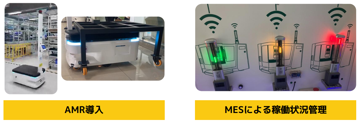 AMR(自律走行搬送ロボット)は搭載したセンサーで周囲の状況を把握しながら自律移動する。工場内の物の移動の自動化させる。 | Wifi接続したMESにより機器の稼働状況をリモート かつリアルタイムで把握分析する。これにより、ダウンタイムを軽減させる。 |