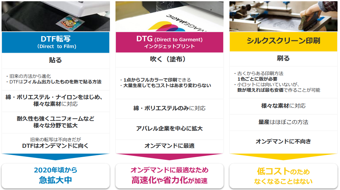 古くから存在する印刷手法が「シルクスクリーン印刷」。文字通り「刷る」印刷方式、低コストだがオンデマンドには不向き。DTF転写はDTGの市場規模拡大を追う形で急成長。