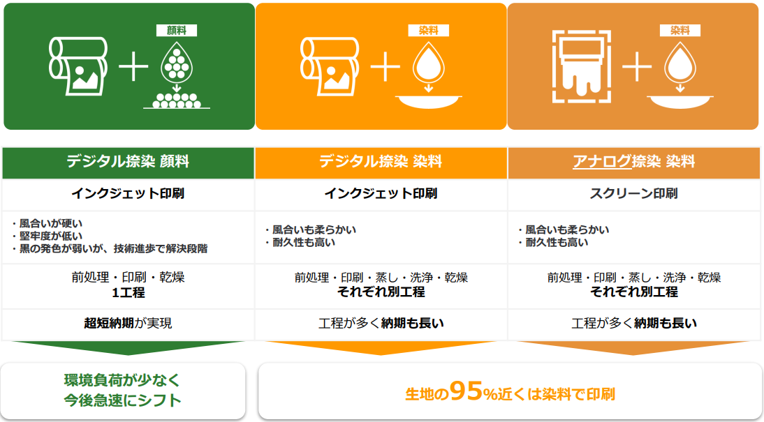 短納期かつ環境負荷の少ない顔料印刷へ今後は急速にシフト。