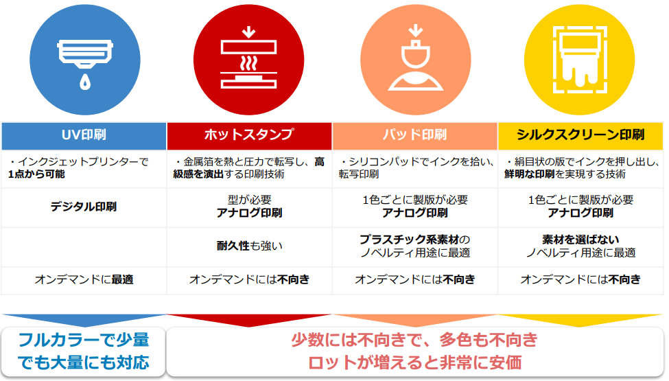 ホットスタンプやパッド印刷、シルクスクリーン印刷といった印刷手法はロットが増えると製造コストが非常に安価だが、少数には不向きで多色にも不向き。一方、UV印刷はフルカラーかつ少量でも大量でも対応が可能。