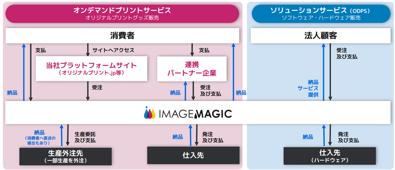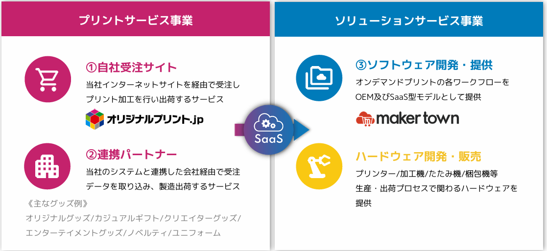 サービスは「(オンデマンド)プリントサービス」及びソリューションサービス。プリントサービスは、①インターネット経由で受注し、プリント加工を行って出荷する自社受注サイト、②同社のシステムと連携した会社経由で受注データを取り込み、製造出荷する連携パートナーからなる。ソリューションサービスでは、③同社のオンデマンドプリントのワークフローを提供するソフトウエアの開発・提供が主軸。ハードウエアの開発・販売も手掛ける。さらには、クラウド生産管理システムを提供して生産管理も行っている。