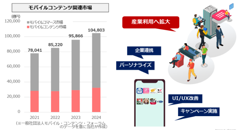モバイルソリューションカンパニーを標榜。個人向けスマートフォンアプリの開発・提供、企業向けシステム開発、モバイルキッティング、e コマース等のサービスを提供しており、事業セグメントは、自社IP(Intellectual Property)を活用したアプリケーションやシステムを提供する「クリエーション事業」と企業の業務用ソフトウェアやシステムの開発を請け負う「ソリューション事業」に分かれる。また、DXを背景に新たなサービスの創出にも取り組んでいる。