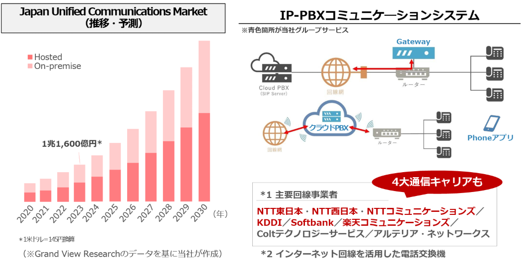 ニーズに合わせてカスタマイズ可能な固定電話代替のスマートフォンアプリ等、多彩な機能を有することで代理店各社の多様なニーズに応えて事業を拡大している。sXGP(※)等 レガシーシステムからの移行需要を獲得することで事業拡大を推進している。AI等最新技術を取り入れたサービス拡充により、新規パートナー獲得も強化している。