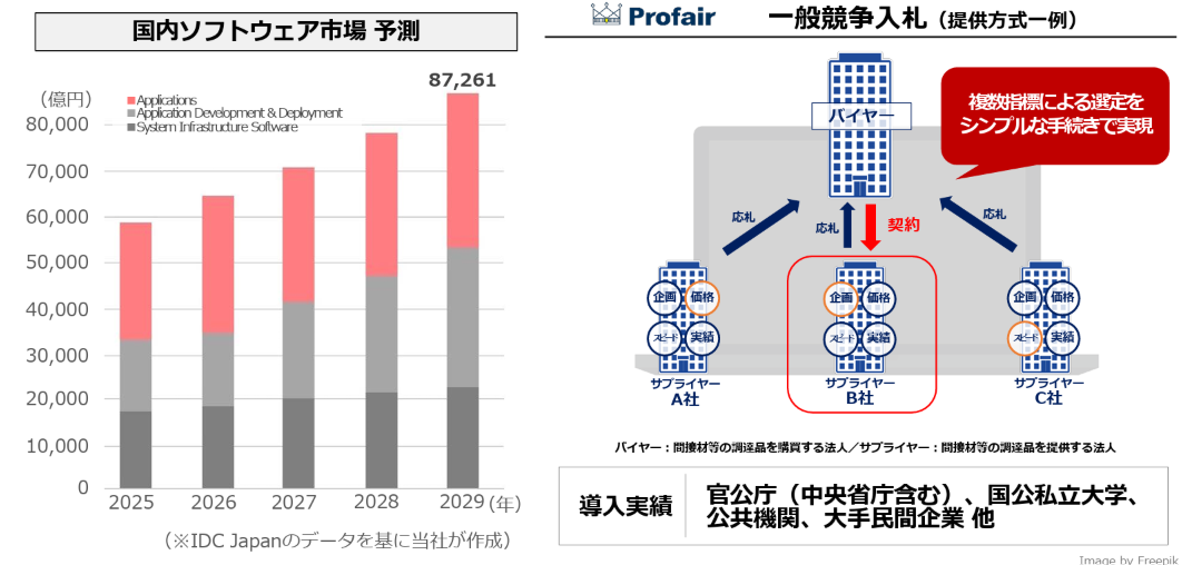 調達業務支援サービスでは、セキュアな環境で公明正大な取引を実現できる定額性クローズ型サービス「Profair」と、購入者側であるバイヤーと販売側であるサプライヤーの間に契約関係がなく、バイヤーが幅広い提案を受け入れることが可能な従量課金制オープン型サービス「日本オープンマーケット」の2つを提供している。