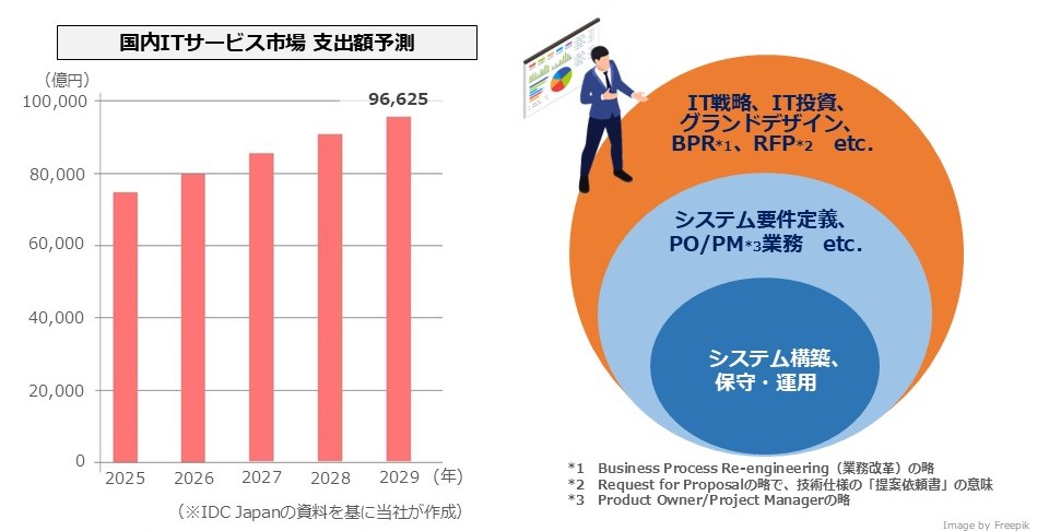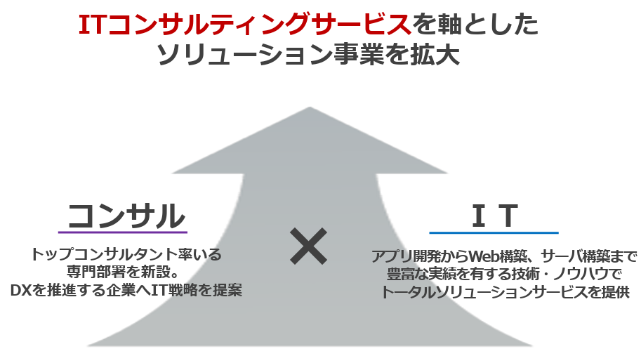 これまでは、システム構築・保守・運用、ユーザーサポート、システム要件定義などを中心に事業展開してきたが、今後はコンサルティング領域を強化し、IT戦略やIT投資、グランドデザイン、BPR、RFPなど、より顧客に寄り添ったかたちで関与することで大型案件獲得による事業拡大を目指す。