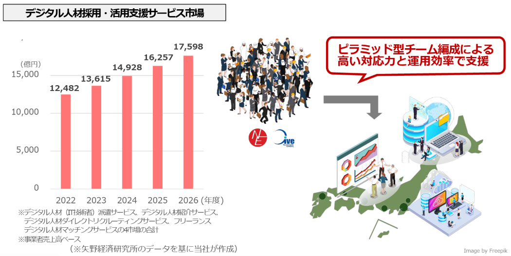 顧客ニーズが高く、拡大が続く市場を背景に高度IT人材等による支援サービスを提供している。ピラミッド型チーム編成による高い対応力と運用効率で主に上流工程を担当し、通信キャリアやメディア局をはじめとした大手企業への営業及び開発領域の支援が拡大している。