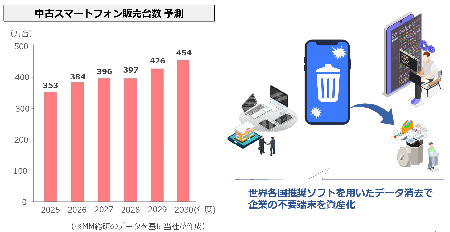 中古端末の需要が法人・個人とも高まっている。特に、通信キャリア等による2年ごとの端末乗り換えプランを背景に、新品を安価で利用しつつ、リファービッシュ品として新品同様にきれいな状態で利用できる中古端末をさらに流通させる取り組みが進んでいる。同社では、世界各国で推奨されているソフトウェアを用いて端末内のデータを完全に消去し、個人情報が漏れない状態で端末を流通させており、今後も中古端末市場は活況を呈していくと見られる中、取り組みをさらに拡大していく。