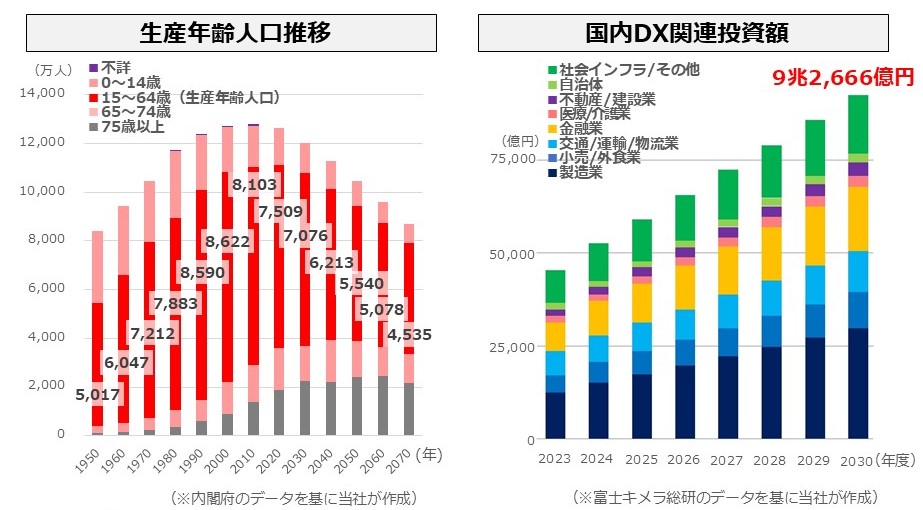 2070年に向けた生産年齢人口の減少とそれに伴う国内市場の縮小により、持続可能な社会構築が一層重視され、DX国内市場は2030年に9兆円超まで拡大すると見込まれている。このような状況下、様々なITサービスを通して顧客に新しい価値を提供するとともに社業を通じて社会貢献していく事を目指している同社は、既存サービスの強化はもちろん、新サービスの創出を積極的に推進していく考えだ。