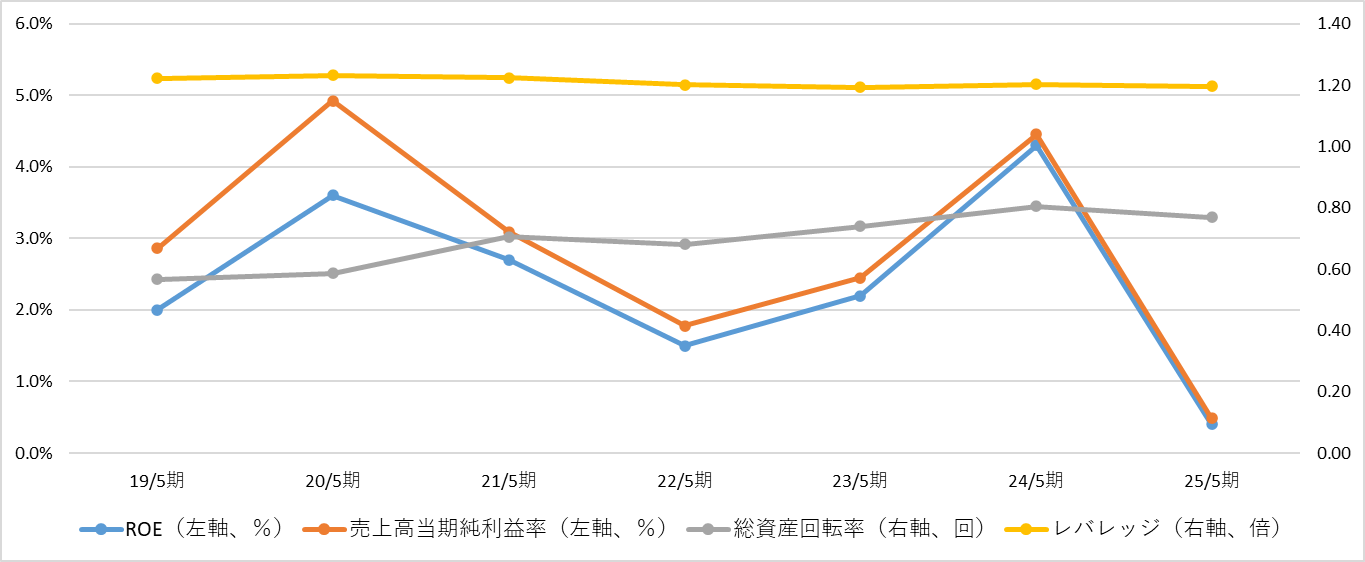 25年5月期のROEは売上高当期純利益率の低下を主要因に前期比3.9ポイント低下し0.4%となった。収益性及び資産効率性を高め、ROE水準の改善が必要である。
