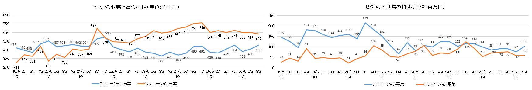 - 業績予想下方修正後の第3四半期(累計)進捗率は売上高72.7%、経常利益44.9%。売上高はほぼ例年並みであるが、経常利益については低水準にとどまっている。四半期ベースの動向を見ると、クリエーション事業の売上高は増加傾向にあるようだが、ソリューション事業は横ばいが続いている。利益については両事業とも力強さには欠けるようだが、キッティング支援(ツール販売)等で伸ばしていく考えだ。同社では、2026年5月期は事業再構築時期と位置づけ、2027年5月期は収益拡大へ邁進するとしている。今期予想達成及び来期2027期5月期に繋げるためにも、ウェイトの高いコンテンツサービス、ビジネスサポートサービス、システム開発サービス等の最終第4四半期における積み上げに期待したい。