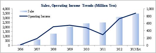 Linical calls for sales to rise by 12.0% year-over-year to ¥3.483 billion in fiscal year March 2013. The processing of significant order backlogs, increases in the number of staff on existing projects, and booking of new project orders are cited as the main factors for the higher sales (Some cancellations and postponement of projects have been factored into these estimates). With regards to profits, cost of goods sold are expected to rise due to increases in CRA staff, while selling, general and administrative expenses are expected to remain in line with the previous fiscal year. Therefore the higher sales are expected to allow operating income to rise by 21.3% year-over-year to ¥883 million. Linical also expects to pay a yearend dividend of ¥11 per share.