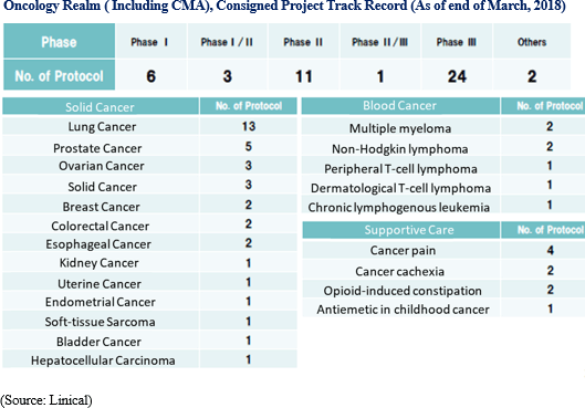Pharmaceutical product development is currently focused upon the three realms of oncology, central nervous system and immune system. Founding members of Linical boast of bountiful experience in the realm of immune system and have provided services in the highly difficult realm of immune system since the Company's founding. Thereafter, Linical has expanded its realms of expertise to include central nervous system in 2006, and oncology in 2010. Currently, Linical's business is based upon the regions of unmet medical needs in these three main business realms of oncology, central nervous system and immune system. In addition, its overseas subsidiaries are also boast of a strong track record in oncology, central nervous system, and immune system related services, which are realms where unmet medical needs are high.