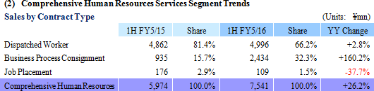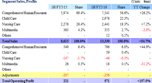 Sales rose by 54.7% year-on-year to ¥13.330 billion during the first half. In addition to the conversion of Success Holdings Co., Ltd from an equity-method affiliate to a consolidated subsidiary from July 2015, the comprehensive human resources services business saw a 26.2% year-on-year increase in sales on the back of consigned sales of mobile and fiber optic communications packaged services. And while the inclusion of Success Holdings as a consolidated subsidiary has been factored into the upward revision issued during the first quarter, actual earnings still exceeded this upward revision.Despite the influence of the conversion of Success Holdings, which has high cost of sales margins, to become a consolidated subsidiary, the increase in sales of the comprehensive human resources services business and better than expected occupancy rates of Sunrise Villa Co., Ltd. contributed to an improvement in the cost of sales margins of the nursing care services business from 94.6% to 91.2%, and allowed overall consolidated cost of sales to fall by 0.8% points to 83.1%. The ability of J-COM Co., Ltd., which conducts the comprehensive human resources services business, to absorb higher sales, general and administrative expenses arising from an increase in the number of staff in the previous term and from the inclusion of Success Holdings as a consolidated subsidiary allowed operating profits to rise by 157.5% year-on-year to ¥571 million. Net profit rose by 6.8 fold year-on-year to ¥1.496 billion due to the booking of extraordinary income. While an extraordinary loss arising from the director retirement benefit of ¥209 million was booked, an extraordinary profit of ¥1.230 billion arising from marginal profits on gradual acquisition of shares of Success Holdings in the process of its consolidation was also booked. ![]() ![]() ![]() ![]() ![]() ![]() ![]() |
