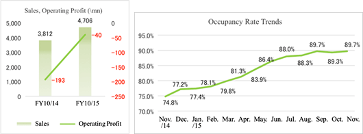 Efforts to strengthen the earnings generating capability of Sunrise Villa Co., Ltd., which became a consolidated subsidiary in October 2013, are steadily being promoted. Currently, this business is expected to turn profitable during fiscal year October 2016 on the back of far greater than expected improvements in occupancy rates derived from efforts to improve service quality through collaboration with J-COM. Sunrise Villa currently operates 1,123 rooms at 21 facilities (Including 2 day care service facilities).