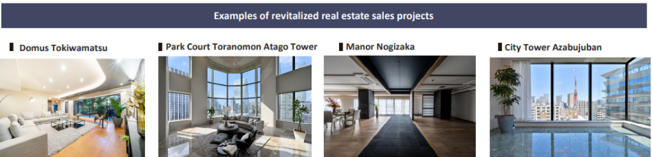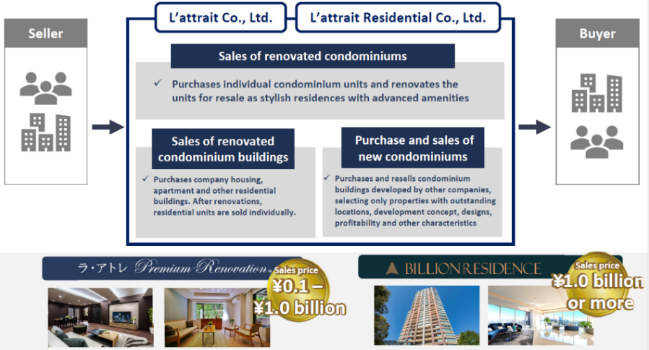 (i) Sale of renovated condominium units | The company purchases second-hand condominium units, plans and draft the details of renovation to restore them as sophisticated residences, which are then sold to general customers and other parties. When purchasing properties, the company carefully reviews and selects properties based on location, price, size, etc., and buys them using information on the settlement of debts through brokers, real estate agents, servicers, and financial institutions. Focusing on premium area in the high price range, used condominiums are furnished with interiors and amenities similar to those in new ones to create unique locations and sophisticated living spaces, enabling attractive products to be offered customers at more reasonable prices than newly built properties with the same conditions. |