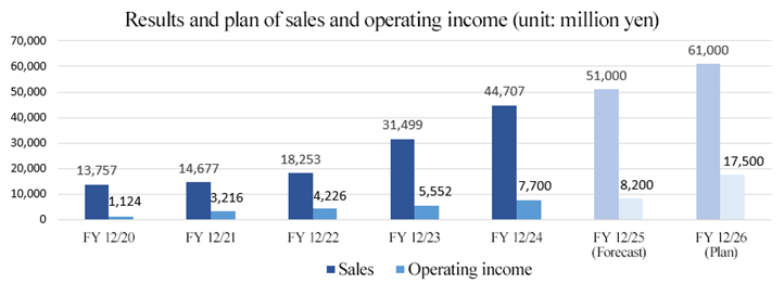 In the fiscal year ending December 2026, the final year of the medium-term management plan, we are targeting sales of 61 billion yen and an operating profit of 17.5 billion yen. As our investment capacity has further increased through the public offering, we can say that sales of 100 billion yen are achievable.