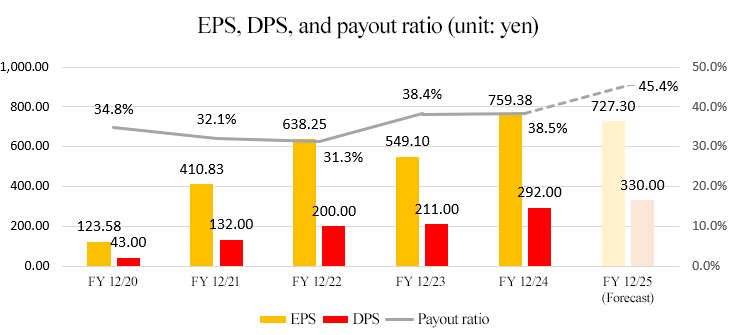 They plan to pay a dividend of 330.00 yen/share, up 38 yen/share from the previous fiscal year. The expected payout ratio is 45.3%.