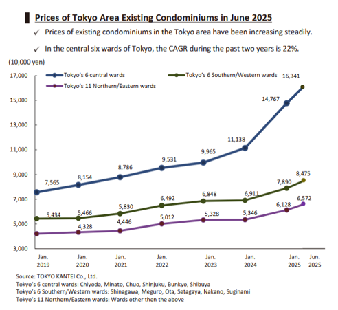 Selling prices of used condominiums in the six central wards of Tokyo have been rising steadily since 2019 and have jumped 33% year on year in FY2025. The gap between these prices and those in surrounding areas is widening.
