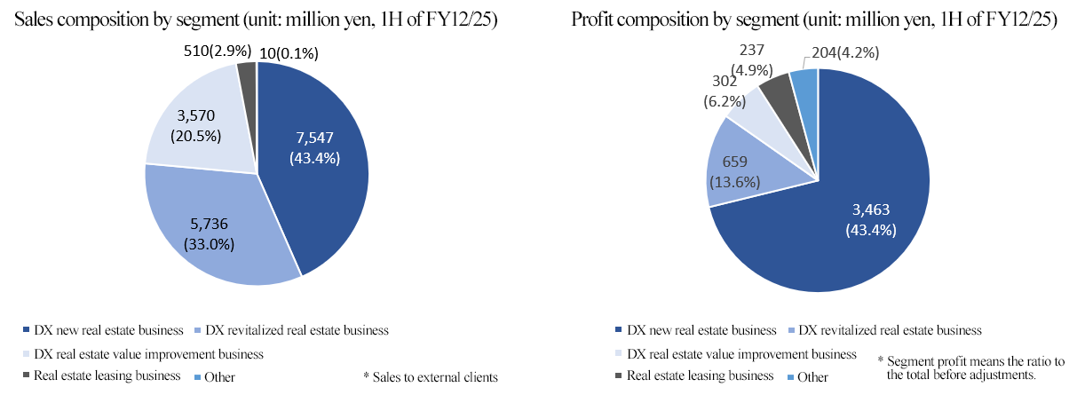 - In the first half of fiscal year ending December 2025, sales and profit grew considerably. Sales increased 24.2% year on year to 17,375 million yen. DX new real estate business and DX real estate value improvement business saw significant sales growth. Operating income rose 153.2% year on year to 3,992 million yen. While gross profit increased 74.2% year on year and gross profit margin rose 9.1 points year on year due to higher selling prices and added value, SG&A expenses decreased thanks to the drop in fees for sale entrusted to other companies as more properties were sold in-house”. Accordingly, profits grew significantly. Considering the favorable business performance and the increase of opportunities to return profit to shareholders, they decided to pay an interim dividend (165 yen/share) for the first time.