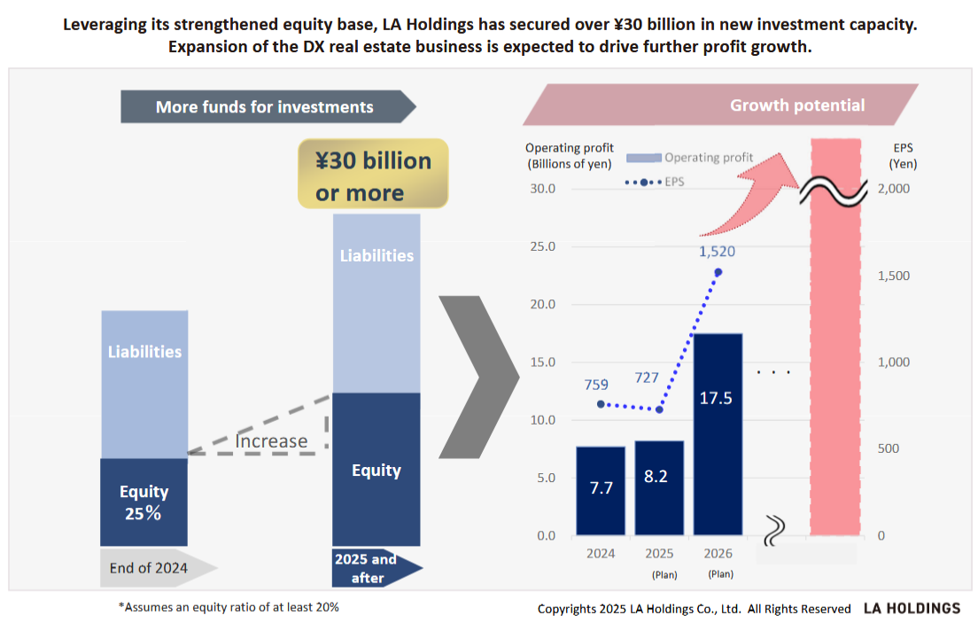 In June 2025, the company raised approximately 7.5 billion yen through a public offering of new shares. In recent years, financial institutions have raised their credit lines significantly, enabling the company to pursue business growth by increasing the number of projects. This public offering has created a new investment capacity of over 30 billion yen, which the company aims to use to further accelerate the pace of sales and profit growth.