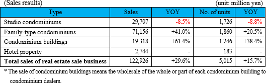 Sales of studio condominiums, which declined during the previous fiscal year, are expected to see a substantial increase. Sales of family condominiums will be steady.