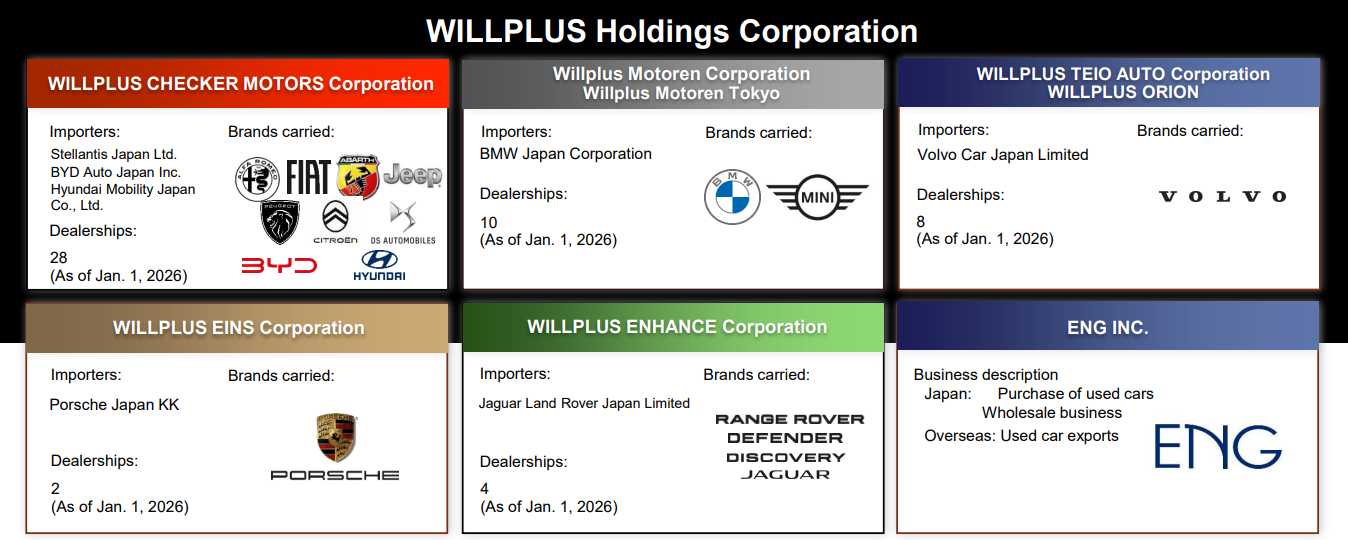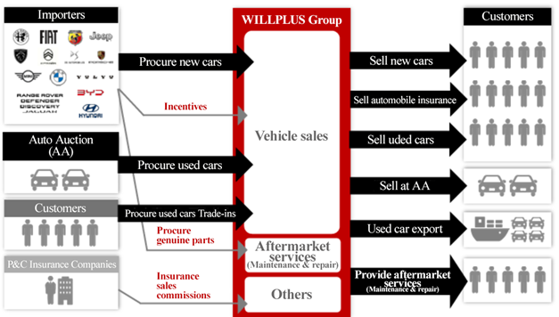 Under the holding company Willplus Holdings Corporation, eight consolidated subsidiaries engage in sales of imported new and used cars, vehicle maintenance, non-life insurance agency business, and used-car export. The company handles 17 brands. The company has an official dealer contract with an importer (a company that handles imported cars in Japan) for each brand it handles.