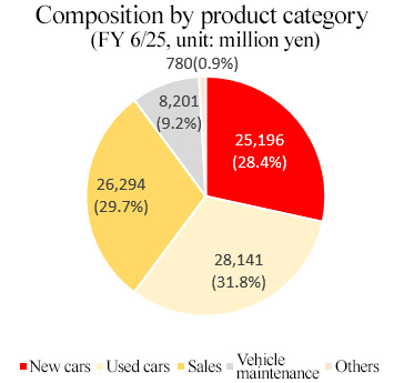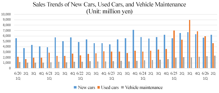 The company discloses sales classified into the categories of new cars, used cars, auto auction sales, vehicle maintenance and other services in the summary of financial results. The company also discloses the domestic and overseas breakdowns of used car sales.