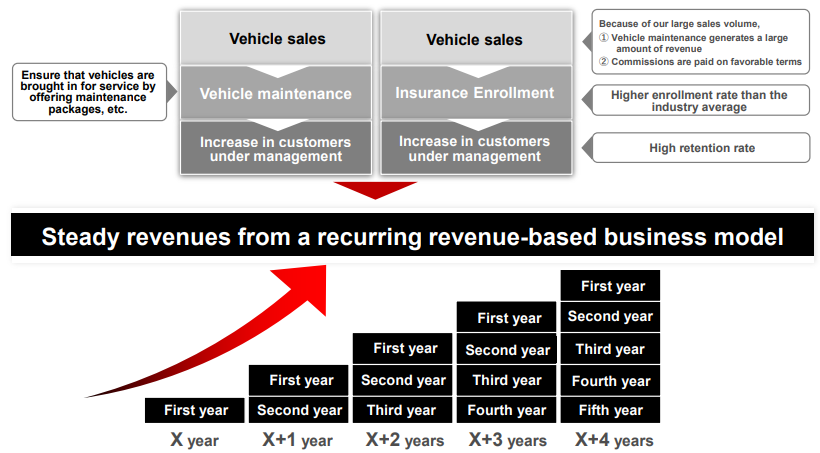 In addition to “the increase in the number of units sold = the increase in one-shot revenue,” an increase in the number of stores through M&A has led to an increase in recurring revenue in the form of “increase in the number of car maintenance and insurance contracts.”