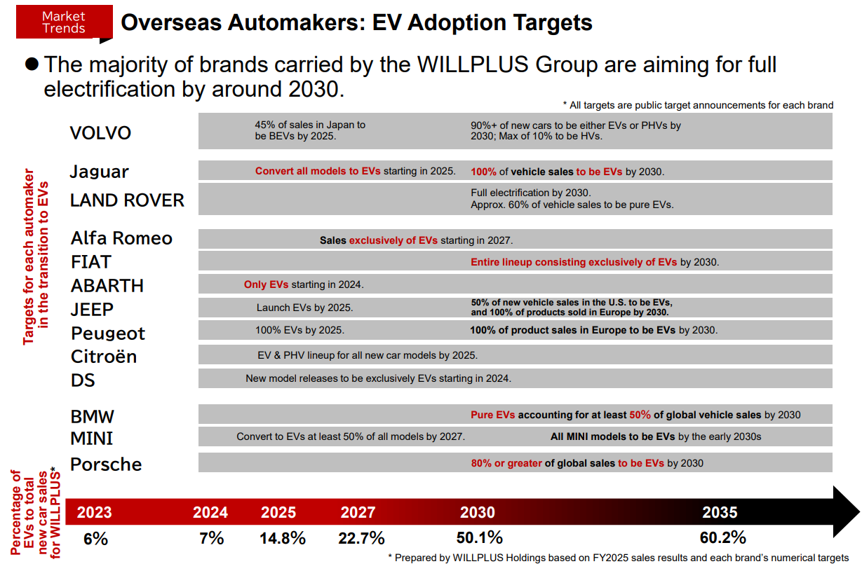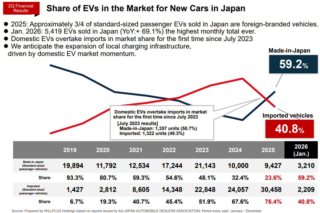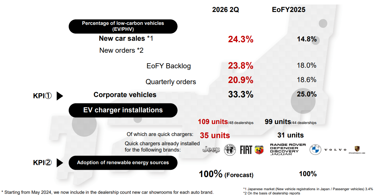 The imported car manufacturers are proactively addressing environmental issues and the majority of brands in which the company deals have announced plans aiming for complete electrification by 2030. On the other hand, while Japanese manufacturers have set targets for EV sales volume and sales ratios, their expansion pace has been slower than overseas competitors; however, in January 2026, the share of domestically produced EVs in the domestic new car market exceeded that of imported vehicles. This is the first time since July 2023. The revitalization of the domestic EV market is expected to lead to the expansion of infrastructure.