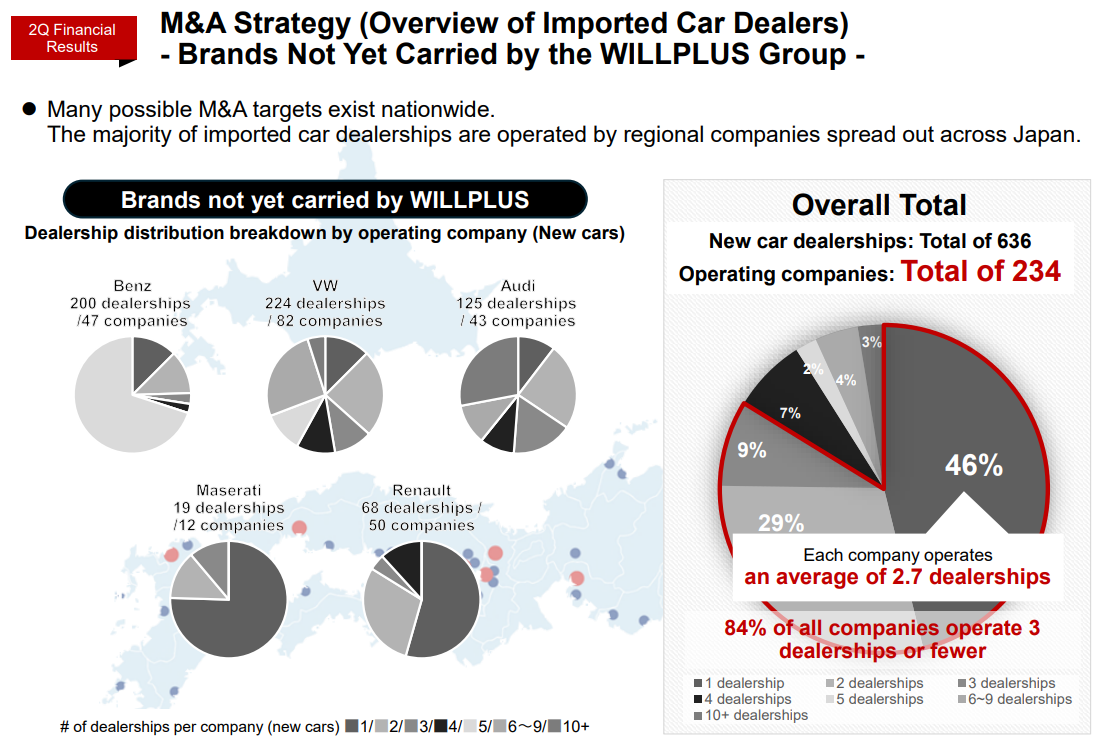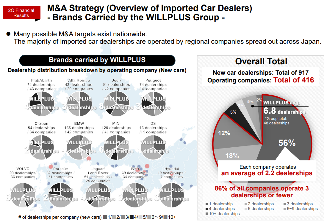 Willplus Holdings Corporation is a holding company with 7 dealers handling 17 brands of imported cars, including Jeep, BMW, Mini, and Volvo, and a consolidated subsidiary that operate used-car purchase, wholesale, and export. It focuses on improving customer satisfaction and pursues growth through a multi-brand strategy, a dominant strategy, and an M&A strategy. It has a significant advantage in business revitalization capabilities in the M&A field. The company aims for further growth, taking the major environmental changes surrounding automobiles, including the shift to EVs, as an opportunity.