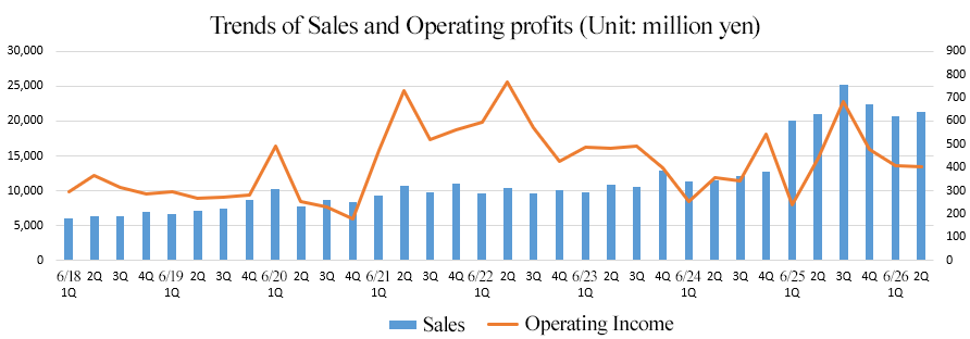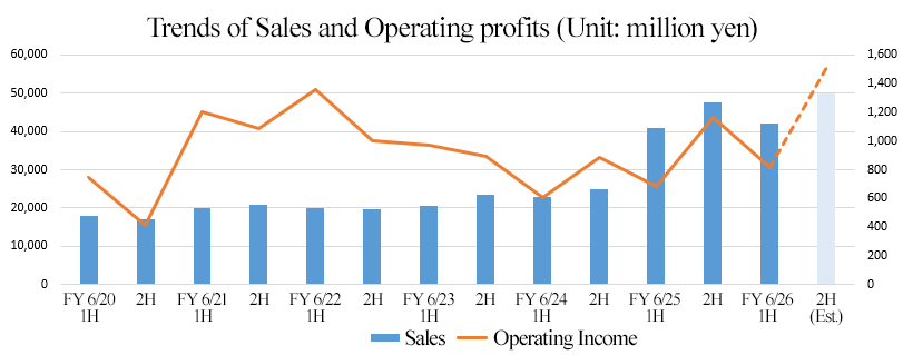 - In the first half of the fiscal year ending June 2026, sales increased 2.5% year over year to 42,096 million yen. This increase was driven by higher demand in the used car market and our expanded service network. Operating income increased 18.8% year on year to 813 million yen. Gross profit increased 7.1%, outpacing the sales growth rate, due to improved profitability at subsidiaries acquired through M&A in the previous fiscal year. Gross profit margin increased 0.6 percentage points year on year. Although selling, general, and administrative expenses, including labor costs, rent, and depreciation, augmented, these costs were fully absorbed. This was also aided by the absence of special investigation related expenses incurred during the same period in the previous year.