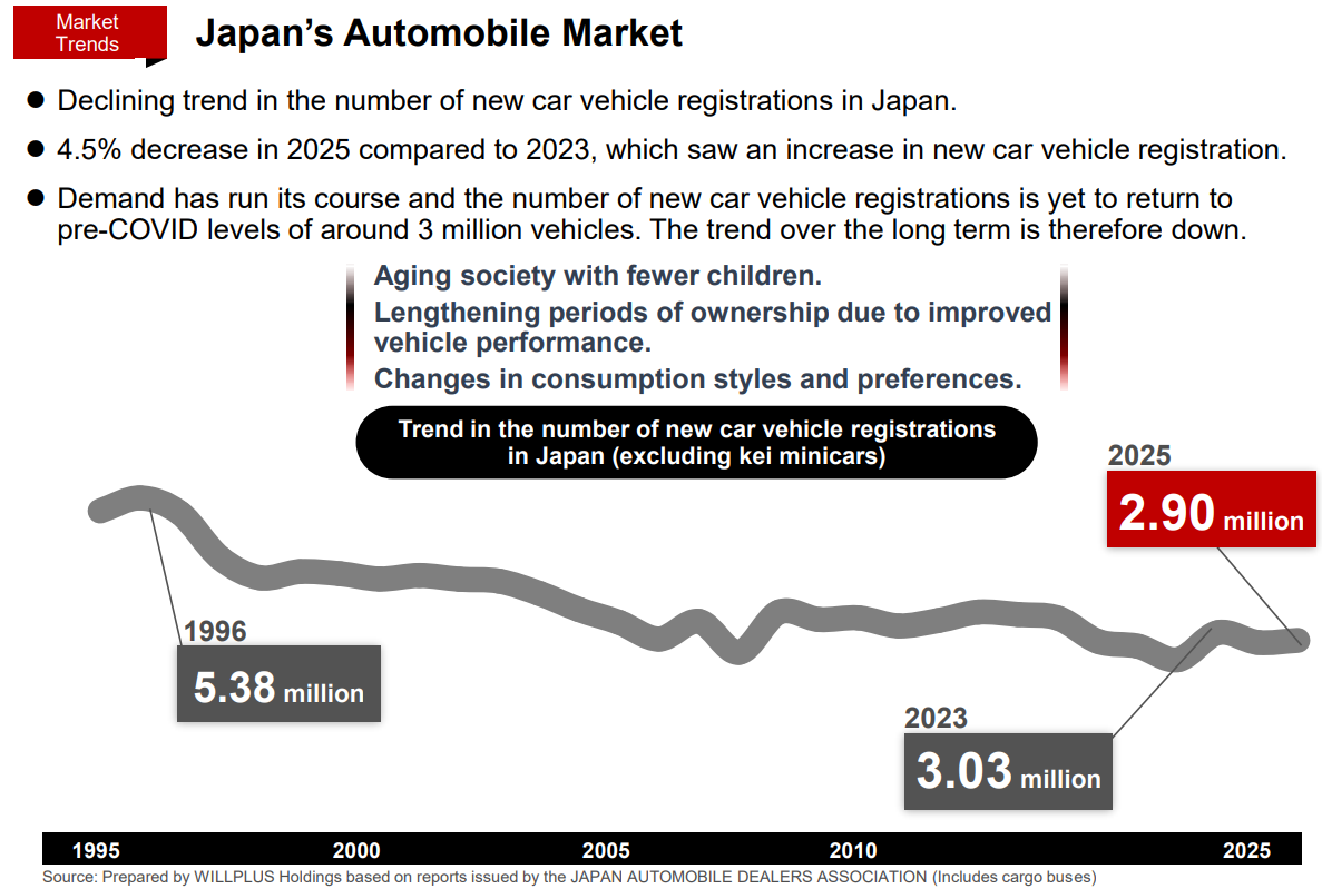The number of new cars registered in Japan shows a decreasing trend due to the declining birth rates and aging population, the prolongation of the period of owning a car due to the elevation of functionality, changes in consumption styles and preferences (decrease of young people who own automobiles), etc.
