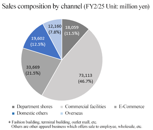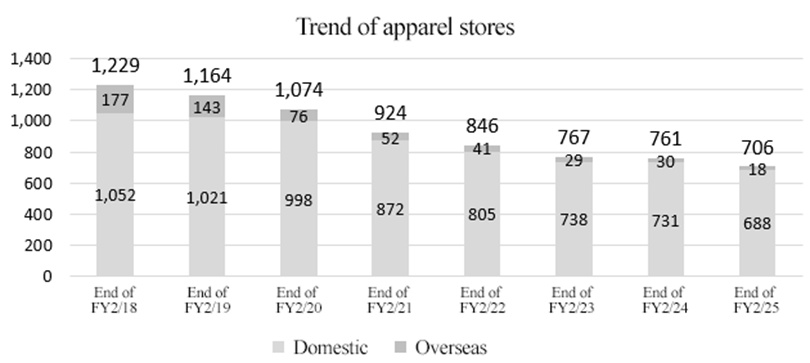 The number of physical stores was 739 (including overseas) as of the end of the fiscal year ended February 2025. Among them, 706 stores sell apparel.