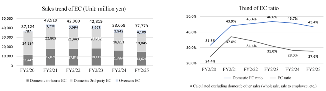 The ratio of sales via their own websites to domestic EC sales had been rising, but dropped consecutively in the fiscal years ended February 2024 and February 2025 due to the withdrawal from some businesses. EC sales have been declining after peaking in the fiscal year ended February 2021, and reigniting growth remains a key challenge.