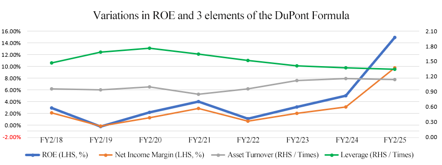 In the fiscal year ended February 2025, ROE rose significantly from the previous fiscal year, primarily due to a gain of 23.9 billion yen from the sale of fixed assets recorded as extraordinary income.