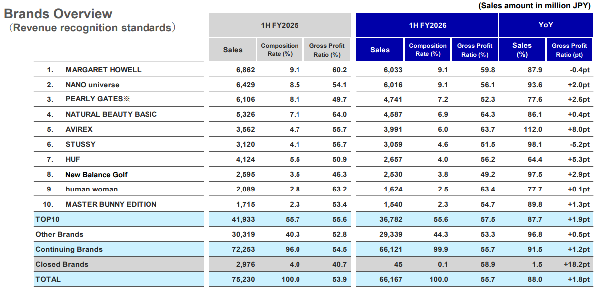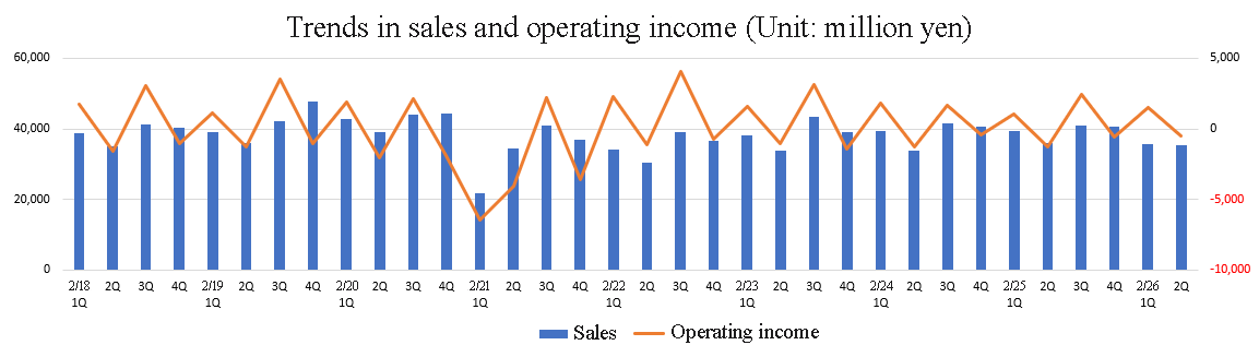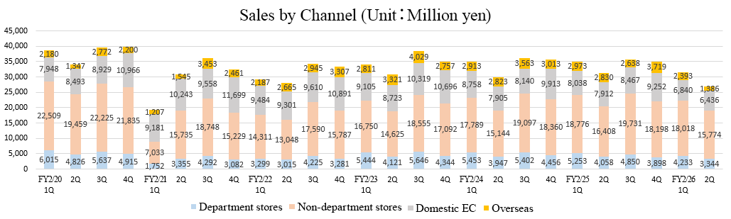 - Although sales declined in the first half of the fiscal year ending February 2026, structural reform proved effective, achieving profitability as a result. Sales decreased 12.0% year on year to 66.1 billion yen, impacted by delay in the transition of the company’s e-commerce (hereinafter, “EC”)site users, in addition to the withdrawal from and sale of some businesses in the previous fiscal year and the struggle to acquire new customers for core brands. Sales dropped in all sales channels. Operating income reached 640 million yen (an operating loss of 221 million yen was posted in the first half of the previous fiscal year) and gross profit fell 9.2% year on year due to the decline in sales. However, procurement cost ratio improved owing to pricing and reduction of procurement costs, and reserves for the negative effects of inventory evaluation decreased as the disposal of stock from the past fiscal years was completed. As a result, gross profit margin improved 1.8 points year on year. SGA dropped 11.3% year on year due to the curtailment of advertising and promotional expenses and personal costs, as well as decrease in expenses linked to sales. Both sales and operating income fell below the initial forecast.
